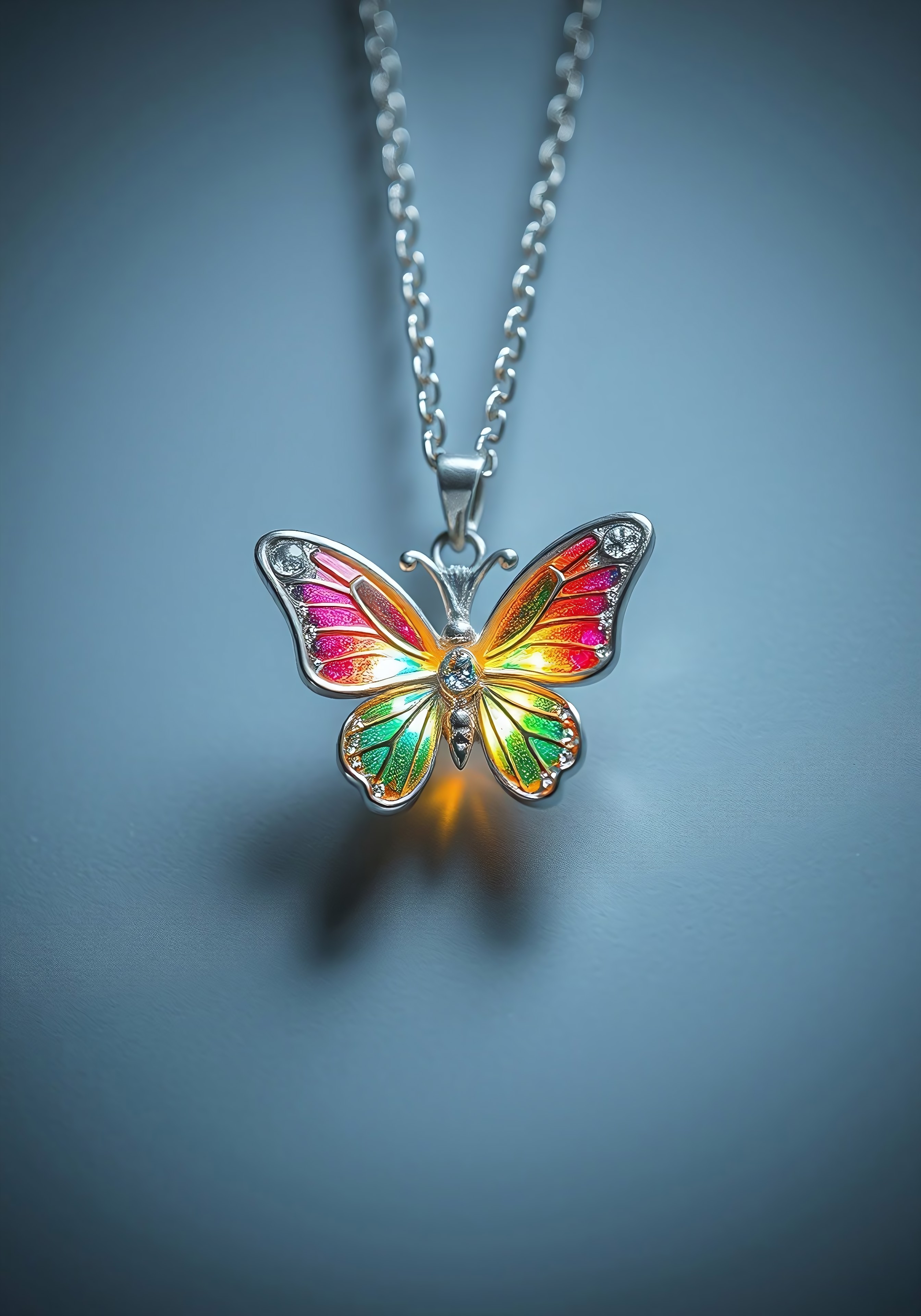 A diminute, very small radiant silver metallic butterfly necklace, adorned with sparkling wings vibrant rainbow hues. The necklace floats in the air, as if worn by someone invisible, creating an almost magical aura.
