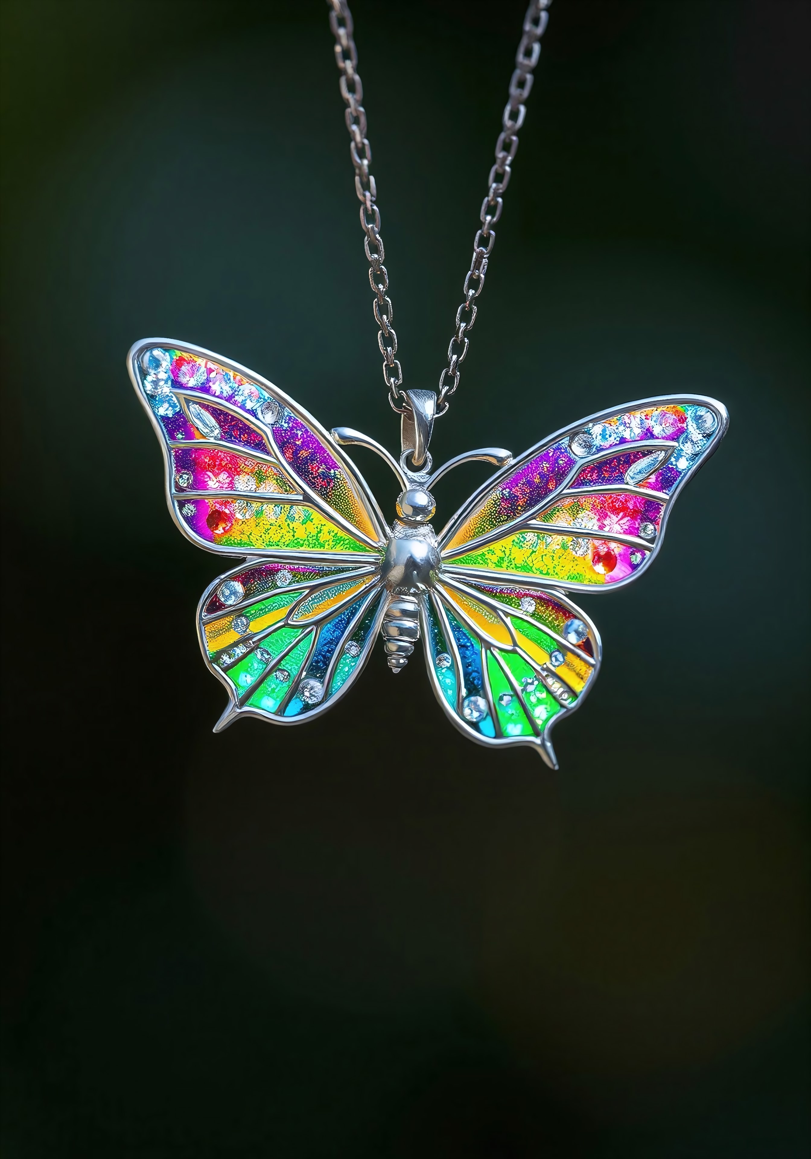A diminute, very small radiant silver metallic butterfly necklace, adorned with sparkling wings vibrant rainbow hues. The necklace floats in the air, as if worn by someone invisible, creating an almost magical aura.