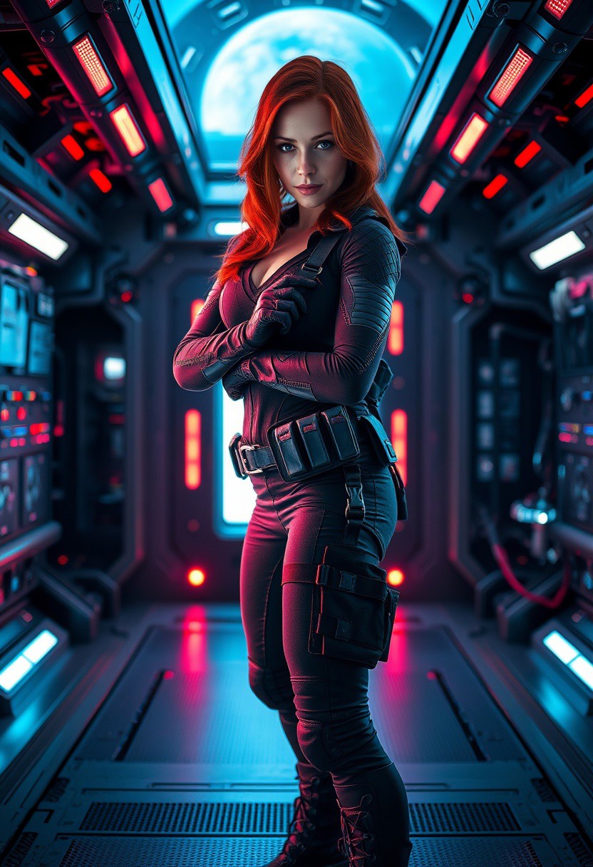 This is a fantastic cosplay shot – Black Widow (Natasha Romanoff) inside what appears to be a futuristic spaceship or high-tech facility. The lighting is dramatic, with lots of red and blue neon accents, creating a really cool cyberpunk/sci-fi vibe. She's posed confidently, looking directly at the viewer. Her costume is detailed - tactical pants, a form-fitting top, and various pouches and straps. The background is complex: panels, lights, and what looks like a window showing space. The overall aesthetic screams "serious badass."
