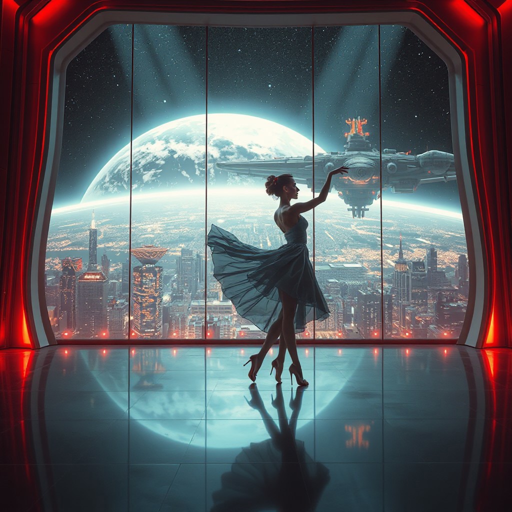 immaculately detailed realistic ultra quality image of a beautiful elegant female dancer is dancing on a futuristic stage micro-LED lighted, behind the dancer on the stage is an enormous seamless and futuristic wall to wall and floor to ceiling window that looks out at a the planet's surface, the planet is covered with the lights of enormous buildings and cities, An enormous deco starship with futuristic lighting and an enormous space station are visible in the background among the stars, Artistic art deco, dynamic perspective, (((overall architectural aesthetic is Art Deco Cyberpunk))). Epic image that elicits a feeling of romanticism, wonder, and awe,