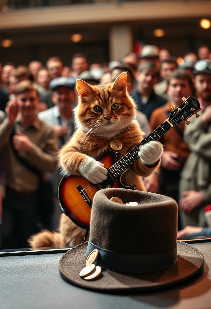 cat playing the guitar for a crowd, hat before the cat. coins in the hat.