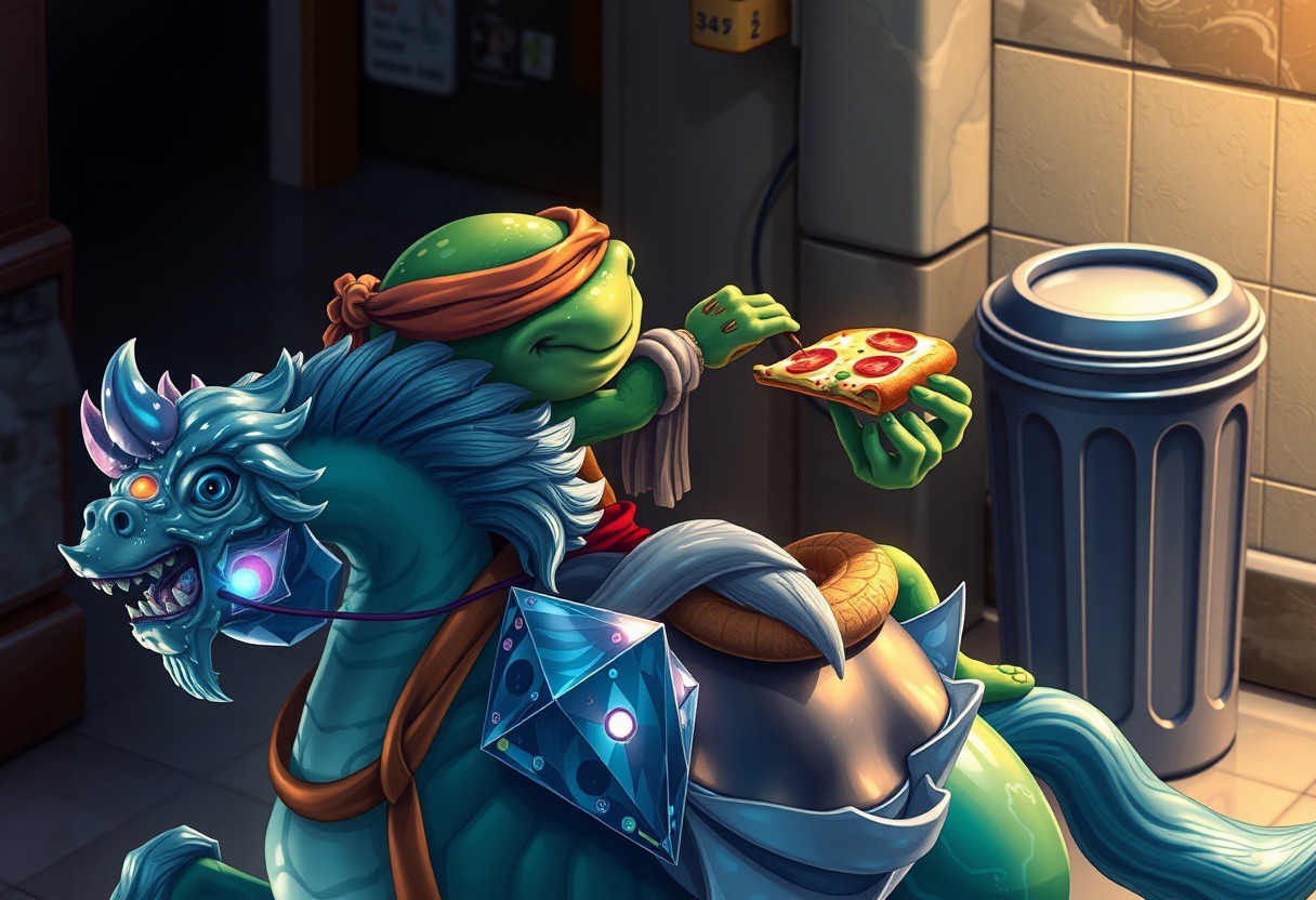 Create a highly detailed, 4K-resolution artwork of a Ninja Turtle eating pizza while sitting on a Crystal Beast Sapphire Pegasus. The Ninja Turtle should have a short spout and a mischievous glint in its eye. The artwork should be inspired by Renaissance-style fine china and have a creepy, oddly familiar atmosphere. The Ninja Turtle's back should be turned towards the viewer, with a trash can visible in the background. The artwork should be created in a style reminiscent of Loish, Murata Range, and Yoshitaka Amano, with vibrant, high-contrast colors and a sense of fantasy. The composition should follow the rule of thirds and the golden ratio, with intricate details and a cel-shaded look.
