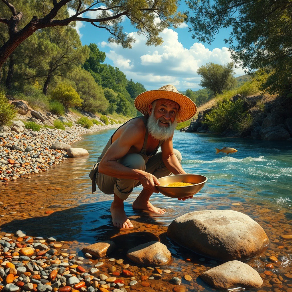 anatomically correct, complex shadows, intricate details, high quality, hi res, best quality, elderly man, muscular, far attire, straw hat, crouching in a river, sifting for gold, narrow river, clear river, colourful rocks, small pebble shore, vivid colours, trees, bushes, small fish in river, the elderly man is happy, there is some gold in his sifting pan, the elderly man isn't wearing boots, the elderly man is barefoot, his pants are rolled up to his knees, the elderly man is up to his knees in the river, clear blue sky, beautiful clouds, light shining through the trees, shadows cast onto the river from the trees overhead, big rocks in river, water flowing around the rocks,