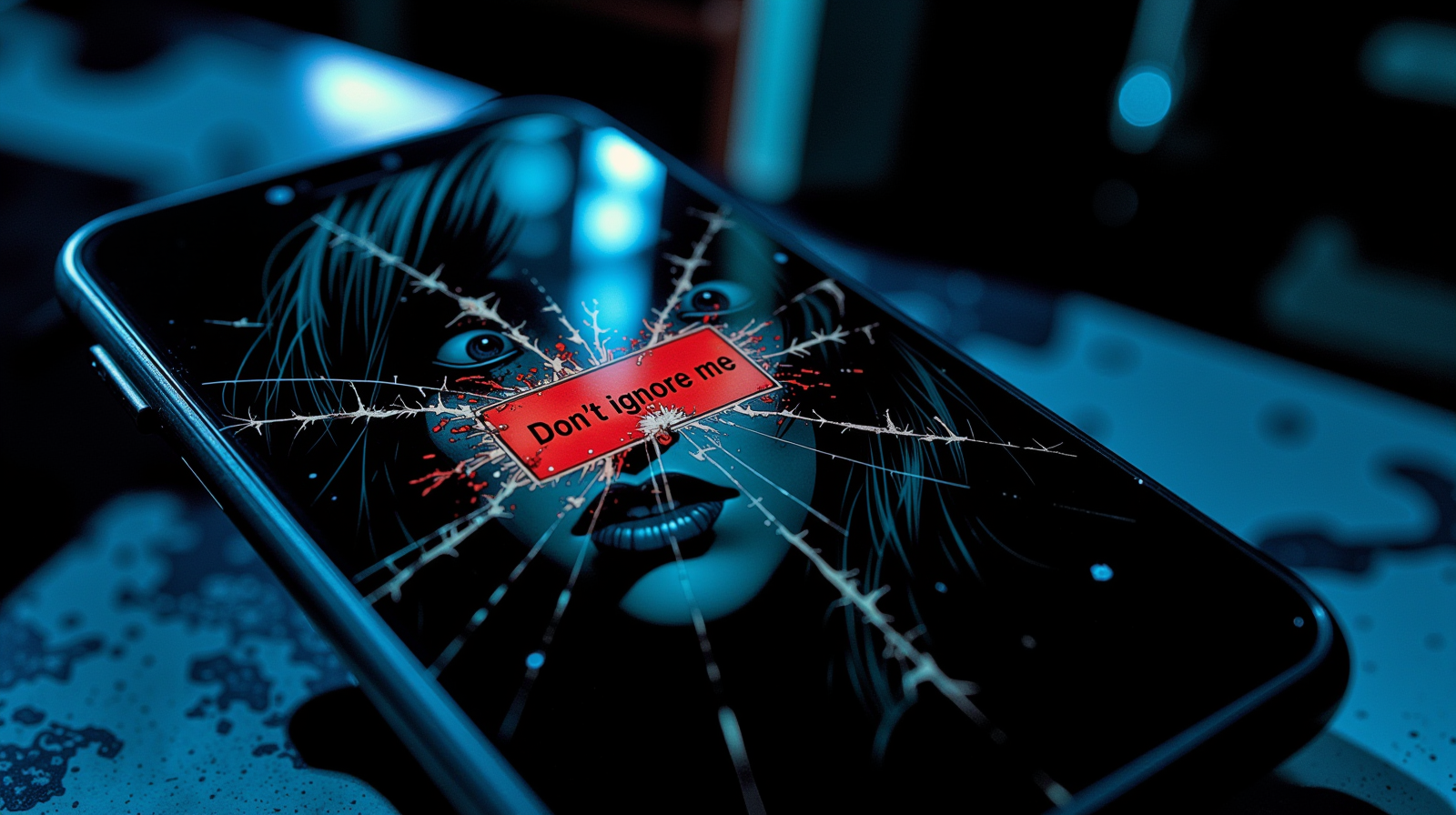 Comic book style Extreme close-up of a cracked smartphone screen at night, displaying a blood-red notification 'Don't ignore me', with a distorted reflection of a terrified young woman in the black screen. Smudged fingerprints, TV static overlay, dim blue backlight. Analog horror style, inspired by David Lynch, 8K detail.