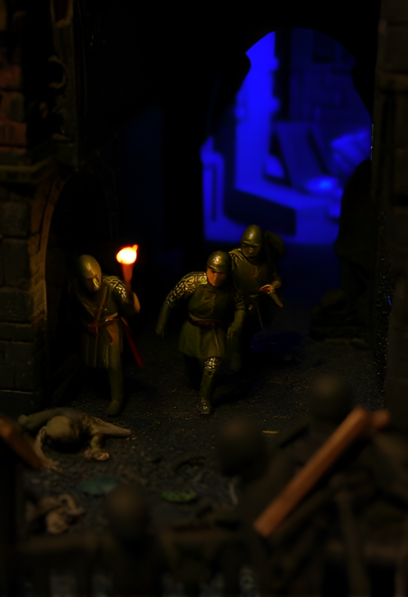 miniature diorama scene, a group of knights moving through a dark dungeon. One of the knights is holding a torch, partially lighting the scene. There are skeletons and rubble scattered around. The lighting is dark, except for the torch, with blue highlights in the background.