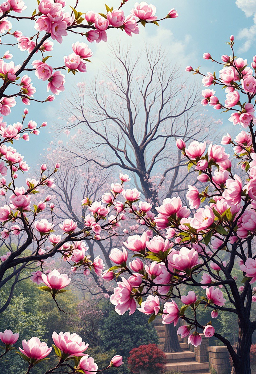 A beautiful landscape reminiscent of a spring. A garden with a warm wind blowing. garden filled with blooming plum blossoms. You will be enchanted by the beautiful paintings. best quality, 8k, ultra-detailed, very aesthetic, superb composition, finest details, intricate details, absurdres, high contrast,