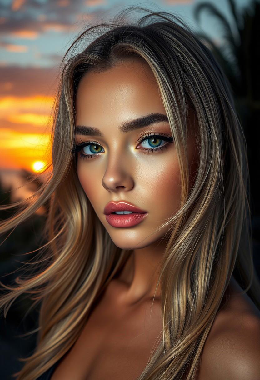 Hyperrealistic highly artistic glamorous photo portrait ((one and a half shot, medium shot)), Hidden angle. ((Stunningly beautiful young supermodel)), Charming ideal beauty ((Seductively sexy and sultry)), ((Elegant -s100 refined -s100 noble facial features)), ((Thin straight narrow neat nose)), ((Delicate polished porcelain pale matte skin)), Full very large very plump lips, Large expressive sapphire-emerald bright eyes, The wind blows her Beach waves thick shiny Pastel Ombre hair, Her piercing arrogant look is full of mystery and magnetic charm, Her image is mesmerizing, enchanting and captivating. Matte makeup. Chic Glamorous Artistic style, ((Eccentric)). ((Natural colors, better face lighting)). Against the backdrop of palm trees and a flaming sea sunset, Professional shooting on a 64-megapixel DSLR, Canon telephoto lens, ultra-high quality, super-fine textures, (Photorealism, Ultra-realism), (epic), (masterpiece), Symmetry, golden ratio, 32k UHD, HDR,