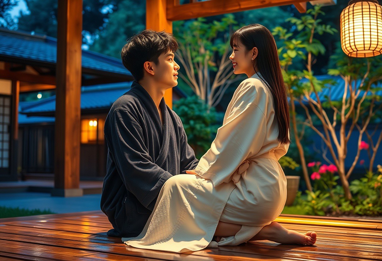 On a summer night, a young Japanese husband with short black hair had just finished taking a shower. He walked out of the Japanese house in a dark blue bathrobe and came to the Japanese garden. He sat on the wooden floor with his back against the wooden beam to enjoy the cool air. His young Japanese wife with long straight black hair also finished her shower. She came to her husband in a white bathrobe, leaned her back against his chest and sat on his lap as if he were a chair. The husband speaks love words in his wife's ear, and she smiles as she listens. The atmosphere is romantic, beautiful, and full of Japanese style. FHD, Rich in details, masterpiece.