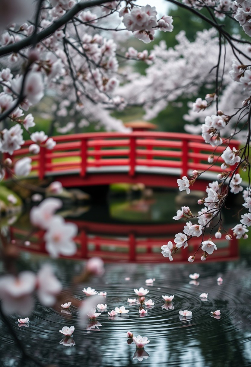 Pond in a Japanese garden, plum blossoms, floating plum blossoms, water ripple effect, Red wooden bridge, beautiful view, depth of field, masterpiece, best quality, 8k, ultra-detailed, very aesthetic, superb composition, finest details, intricate details, absurdres, high contrast, ray tracing, Volumetric lighting