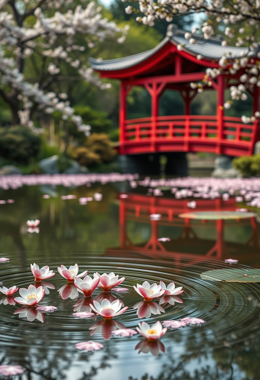 Pond in a Japanese garden, plum blossoms, floating plum blossoms, water ripple effect, Red wooden bridge, beautiful view, depth of field, masterpiece, best quality, 8k, ultra-detailed, very aesthetic, superb composition, finest details, intricate details, absurdres, high contrast, ray tracing, Volumetric lighting