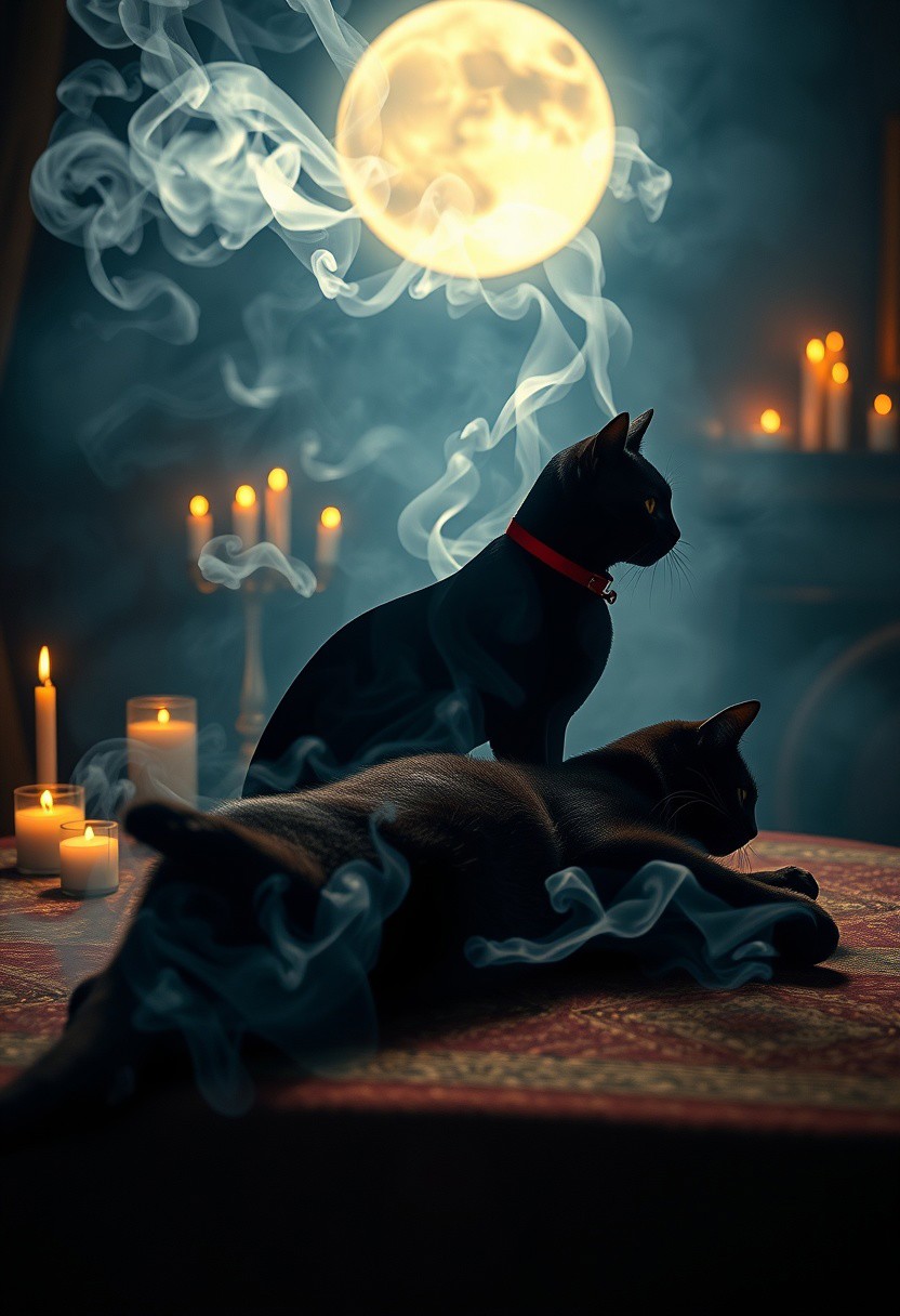 A mesmerizing image of smoke lit with a heavenly light elegantly forming a lifelike cat silhouette sitting on a table next to the prone lifeless body of a black cat with a red collar. The intricate details and vibrant colors of the cat, along with the perfect balance of smoke density and airiness, create an incredible visual effect. The background reveals a mystical or enchanted setting, possibly a dimly lit room with candles, a burning incense, and a moonlit sky. The combination of photo, illustration, 3D render, and painting techniques make this piece a true masterpiece., 3d render, photo, painting, vibrant, illustration.