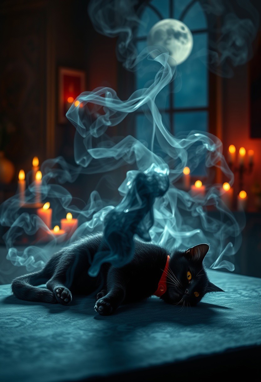 A mesmerizing image of smoke lit with a heavenly light elegantly forming a lifelike cat silhouette sitting on a table next to the prone lifeless body of a black cat with a red collar. The intricate details and vibrant colors of the cat, along with the perfect balance of smoke density and airiness, create an incredible visual effect. The background reveals a mystical or enchanted setting, possibly a dimly lit room with candles, a burning incense, and a moonlit sky. The combination of photo, illustration, 3D render, and painting techniques make this piece a true masterpiece., 3d render, photo, painting, vibrant, illustration.