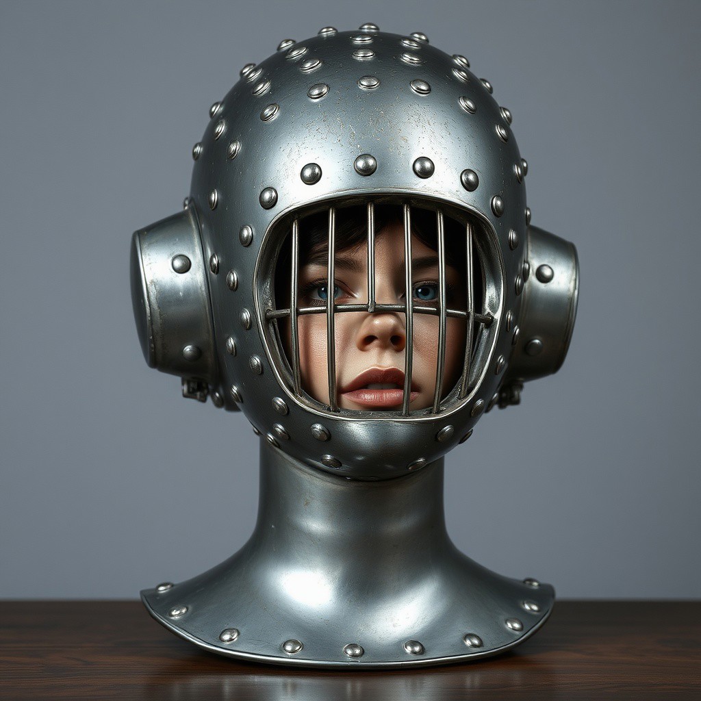 A perfectly smooth steel casings covered with rivets and shaped like a head and shoulders bust of a woman and with a single barred opening on the front of the head (and a woman trapped inside looking out through the barred face openings:1.5)