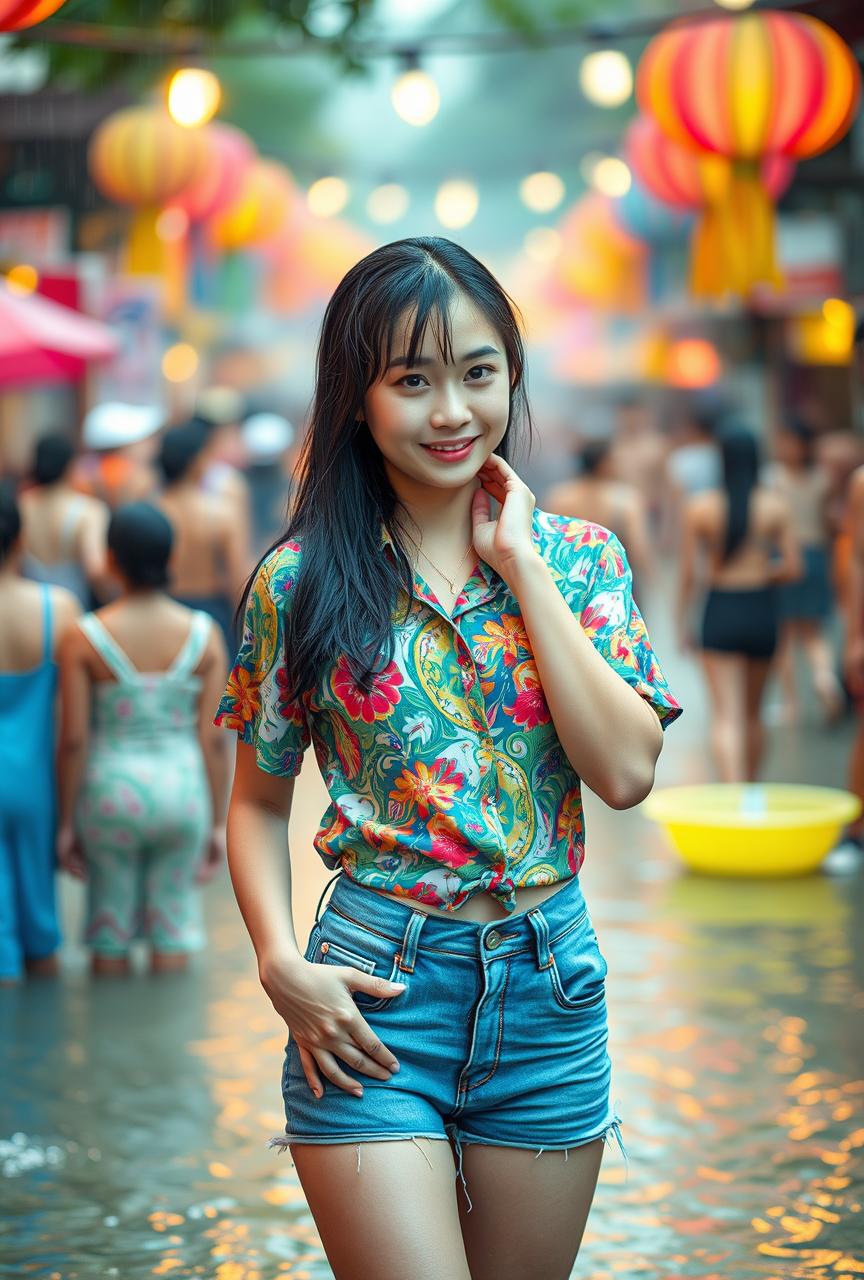 A young Thai woman with pale skin stands in a vibrant water festival, rain-soaked and playful. She wears a colourful patterned shirt and denim shorts, her dynamic pose and sensual touch exuding confidence. People and nature blend in the background, soft pastel colours and natural lighting create a dreamy atmosphere. High-quality, sharp focus and vivid bokeh enhance the scene. Inspired by Wes Anderson's style, the lighting is soft and diffused, with warm overhead lights and cool sidelights, creating a balanced and whimsical mood. Film grain adds texture, and the colour grading is soft and pastel, enhancing the playful and serene ambience.
