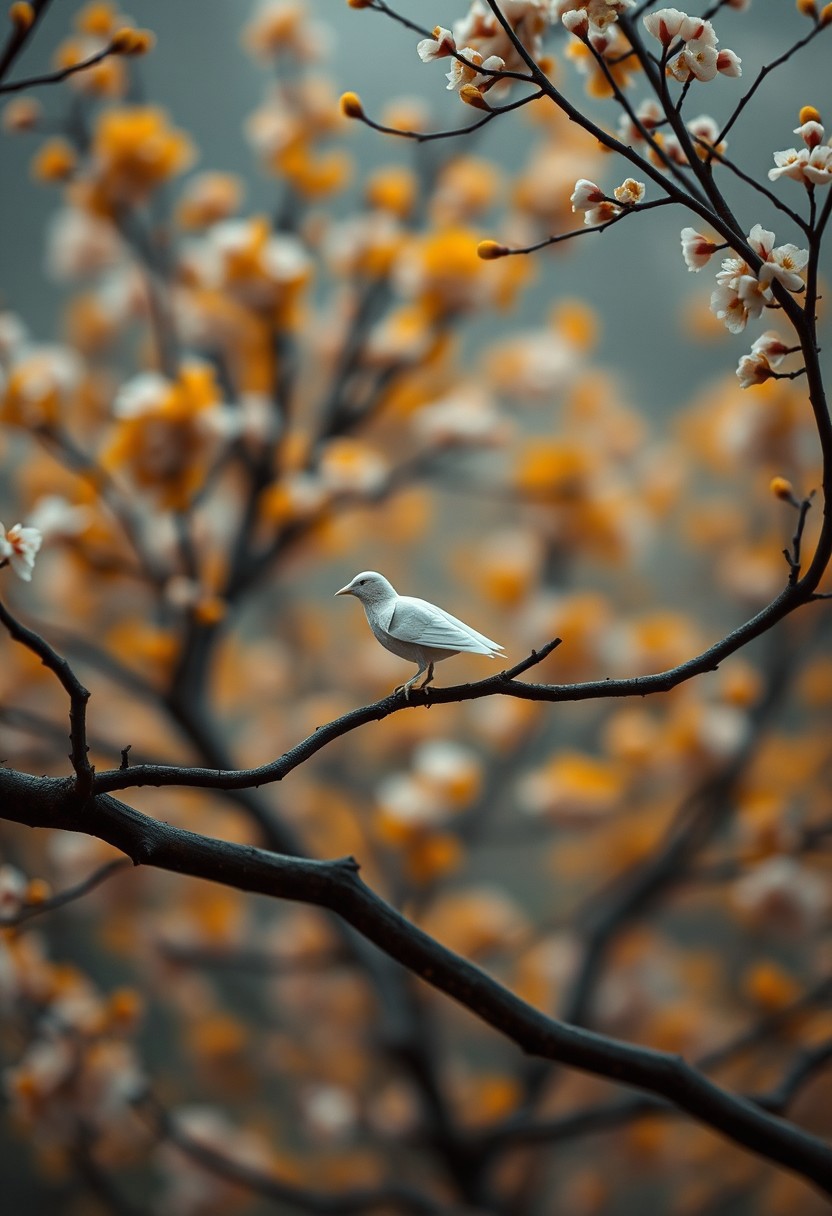 A single, white origami bird perched on a branch of a Sakura, golden tree. Surreal and minimalist. Dark Art, oriental art, ultra high res,