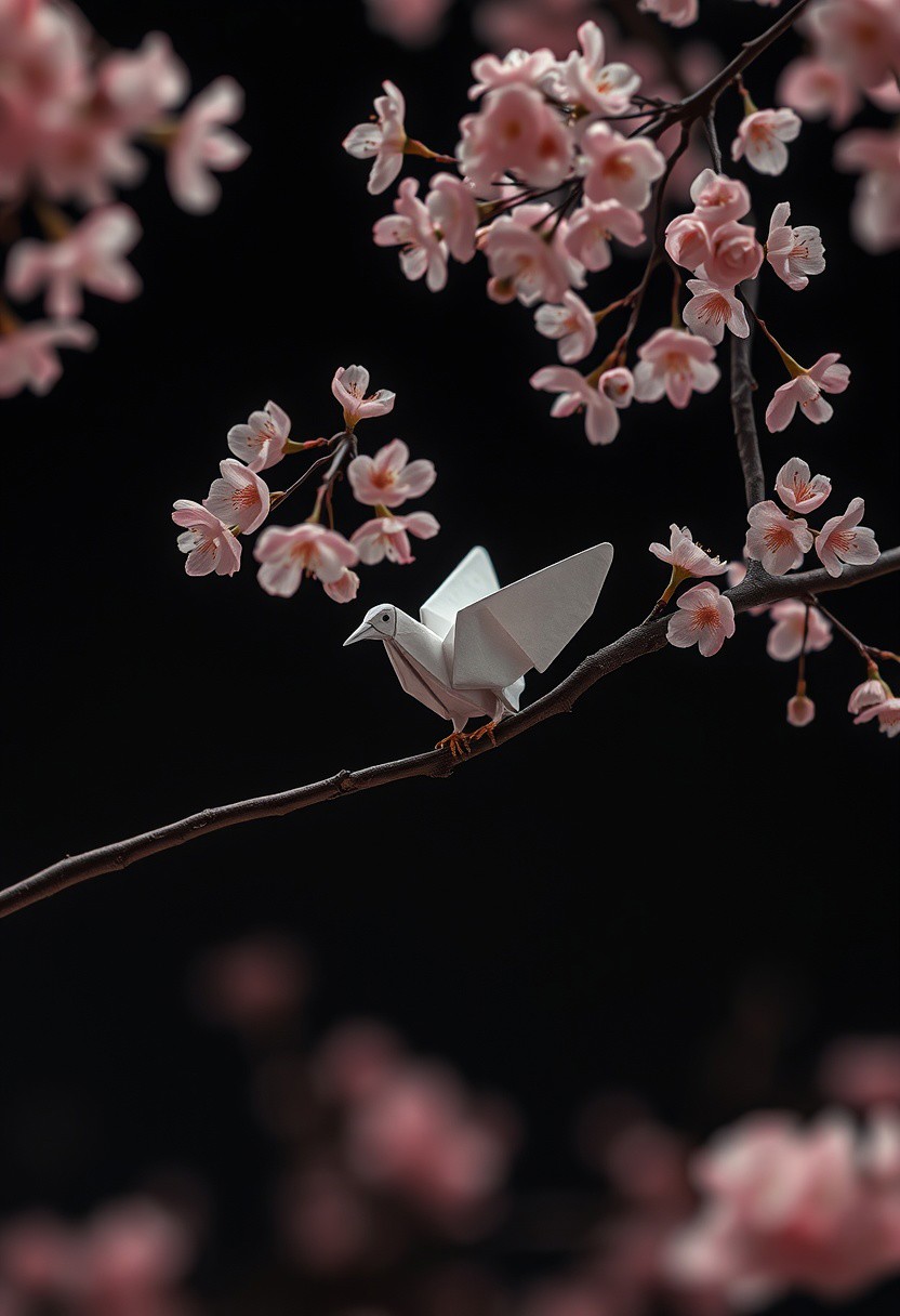 A single, white origami bird perched on a branch of a Sakura, golden tree. Surreal and minimalist. Dark Art, oriental art, ultra high res,