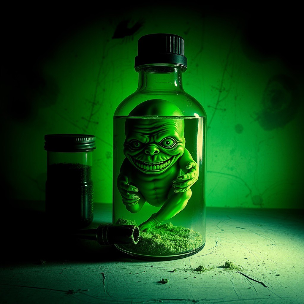 Dark and ominous artwork featuring a lab vat tank containing a green oversized hideous deformed smiling fetus squished inside the small bottle, obscure art, artstation, weird art, occult art, splash art, goth, grotesque, disgusting, shock value, photography, stoner doom, green hue, coverart