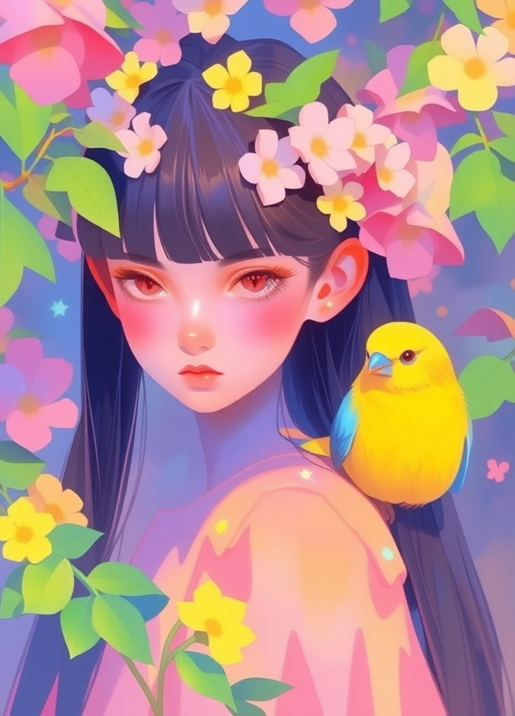 The image is a digital illustration of a young girl with long dark hair and a flower crown on her head. She is wearing a pink dress with a yellow and blue bird perched on her shoulder. The girl is looking directly at the camera with a serious expression on her face. The background is filled with pink and yellow flowers and green leaves. The overall mood of the image is peaceful and serene. it is a vibrant, dreamy, whimsical and clear masterpiece full of details and high quality creating a serene and peaceful scene with glistening lights.