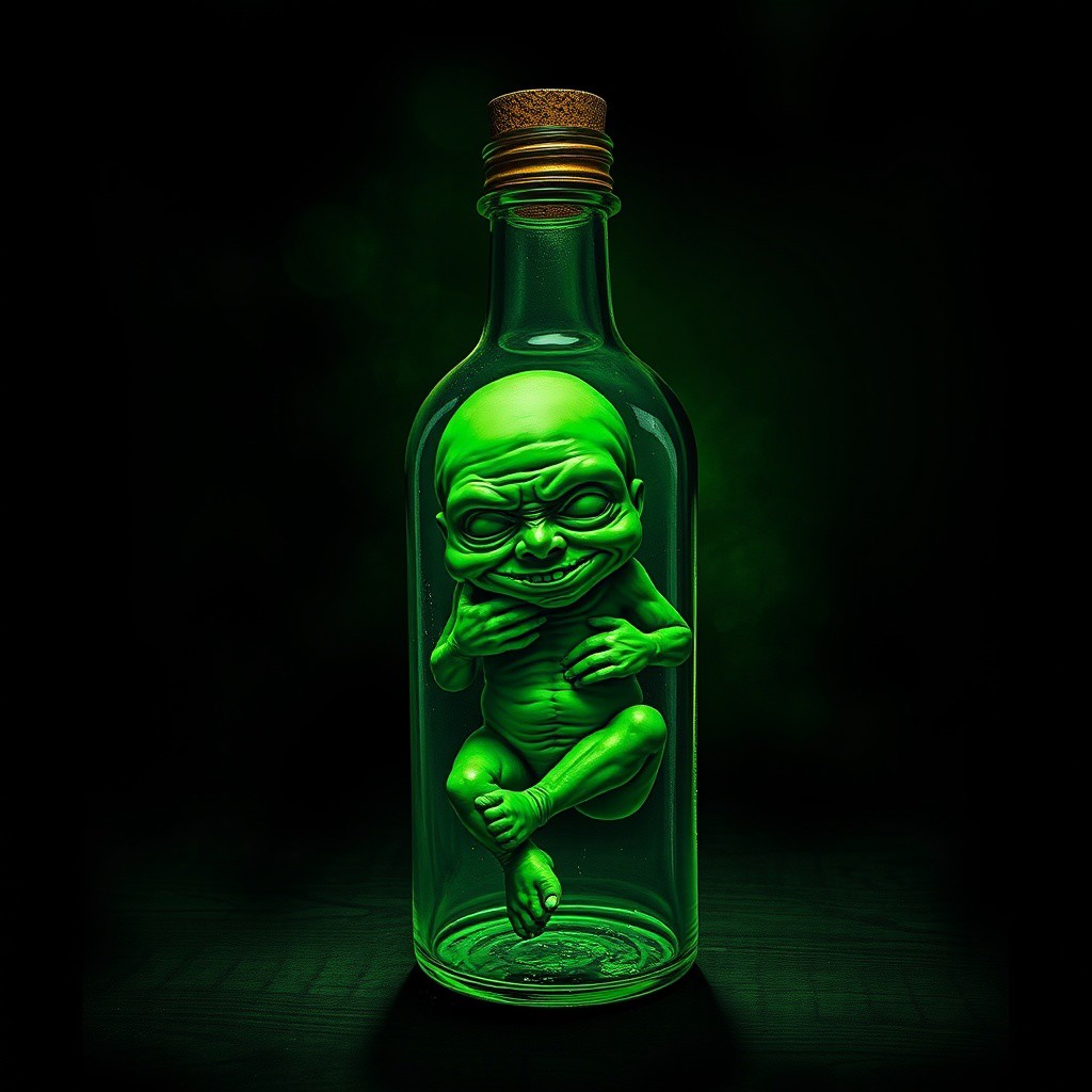 Dark and ominous artwork featuring an old fashioned bottle containing a green oversized hideous deformed smiling fetus squished inside the small bottle, obscure art, artstation, weird art, occult art, splash art, goth, grotesque, disgusting, shock value, photography, stoner doom, green hue, coverart