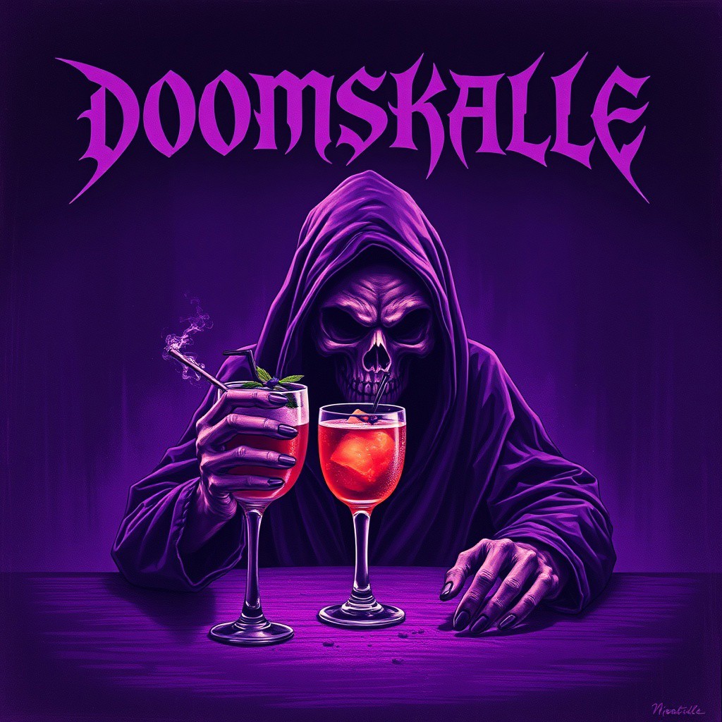 Typical black metal logo spelling DOOMSKALLE in top section, under it is The Grim Reaper drinking a tropical cocktail drink, surrounded by subtle dust and decay. The scene is lit with a deep purple duotone color scheme, casting moody, heavy shadows. The texture is gritty and raw, evoking a dark and psychedelic stoner doom metal atmosphere. The background is dark and minimal, emphasizing the skull and table, with faint hints of smoke or mist swirling in the air. The lighting is dramatic and harsh, creating a brooding, vintage poster-like aesthetic with a grainy, analog feel.