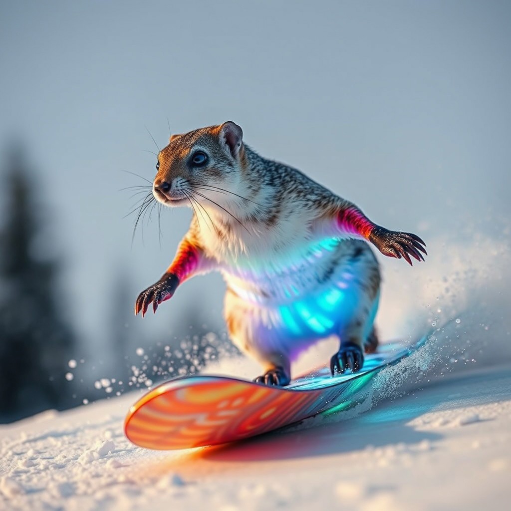 A humanoid weasel on a luminescent, multicolored snowboard descends a snowy slope, extreme close-up, snow powder, speed, sport high level photography