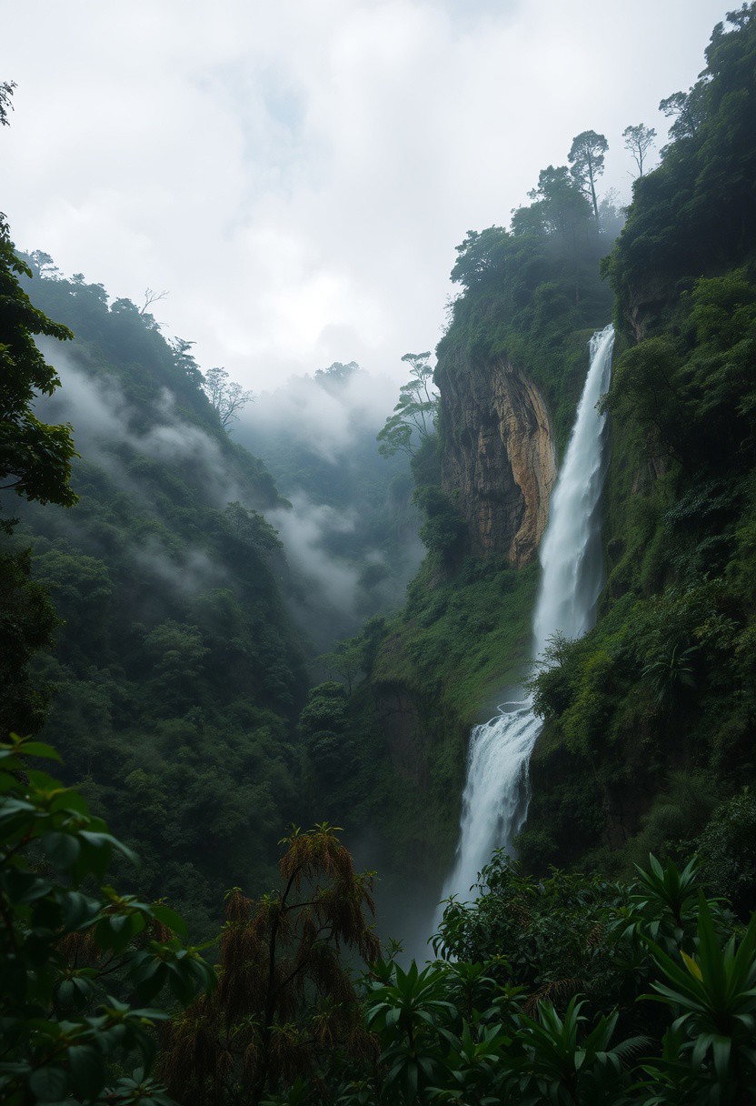 jungle forest, cliffs, day, cloudy sky, wild vegetation, waterfall, Hidden hot springs in the mountains, steam, thick fog, depth of field, masterpiece, best quality, 8k, ultra-detailed, very aesthetic, superb composition, finest details, intricate details, absurdres, high contrast,
