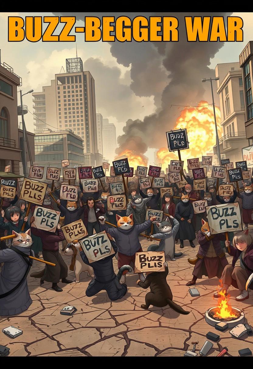 At the top of the image, bold lettering spells out 'BUZZ BEGGER WAR', An intense, epic war scene erupts in a crumbling modern city, engulfed in chaos and destruction. Massive crowds of cats, anime girls, clash in a brutal fight, each warrior fiercely holding up signs that say 'Buzz Pls' in bold, worn-out lettering. The streets are littered with debris, shattered glass, and burning vehicles, as smoke and dust fill the air, casting a dramatic haze over the battlefield. Explosions erupt in the distance, while cats and anime girls engage in hand-to-hand combat, some swinging their 'Buzz Pls' signs like weapons, splintering wood and metal in the heat of battle. Others use makeshift clubs, bats, and shields, their faces filled with desperation and determination as they struggle for dominance. Torn banners and broken signs lay scattered across the cracked pavement, a testament to the ferocity of the conflict. The city, once vibrant, is now war-torn and desolate, its buildings reduced to ruins with smoke billowing from collapsed structures. Fires rage in abandoned cars, and the sounds of battle—screams, clashing weapons, and the distant rumble of destruction—fill the air.