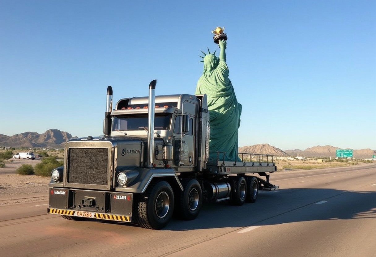A heavy bonnet truck Marmon transports a reduced copy of the Statue of Liberty along a highway in the Mexican desert on a trailed special platform.