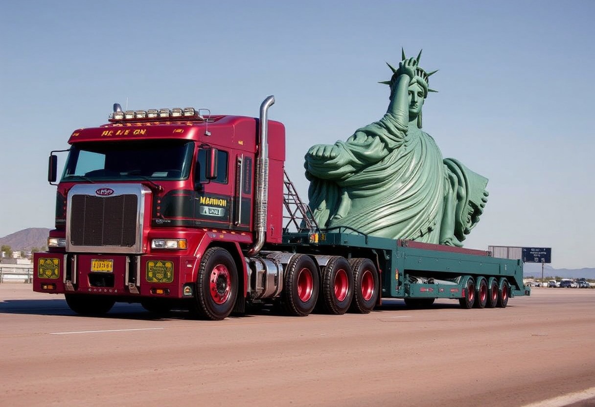 A heavy bonnet truck Marmon transports a reduced copy of the Statue of Liberty along a highway in the Mexican desert on a trailed special platform.