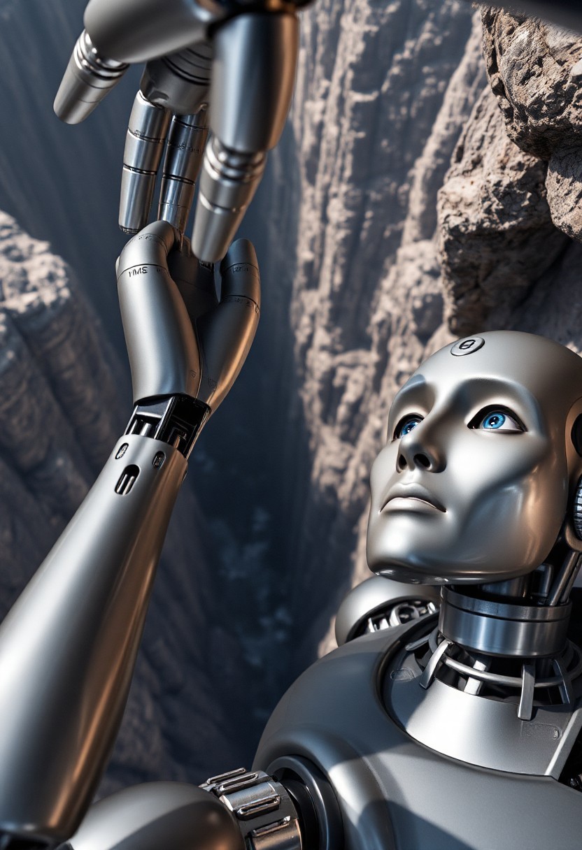 The robot hangs over the abyss with one hand holding a rocky ledge (in close-up, the camera is on top). Another hand with unclenched fingers stretches upwards. The robot's face is raised up, the sensor eyes are open. A titanium mechanical hand with an open palm (with metal joints of joints and metal fingers) stretches from above to the robot.