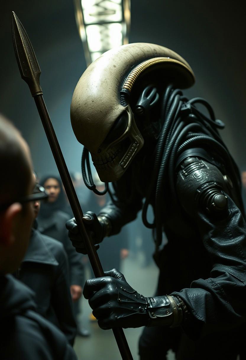 A predator in a helmet worn on his head, made of the Alien's skull, sneaks with a spear through the tunnel of strangers. Image in Giger style.