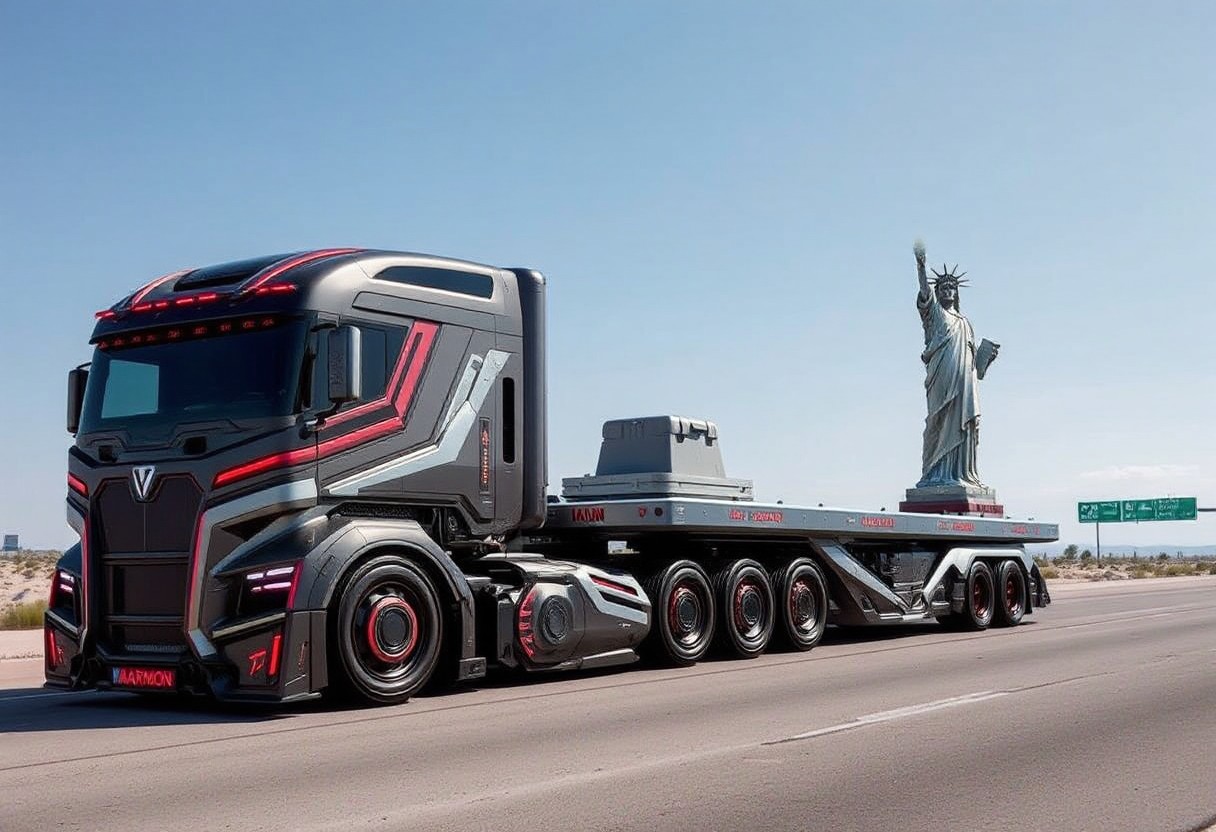 A heavy truck Marmon futuristic design carries on the attached special platform a reduced copy of the statue of freedom moving along the highway in the Mexican desert.
