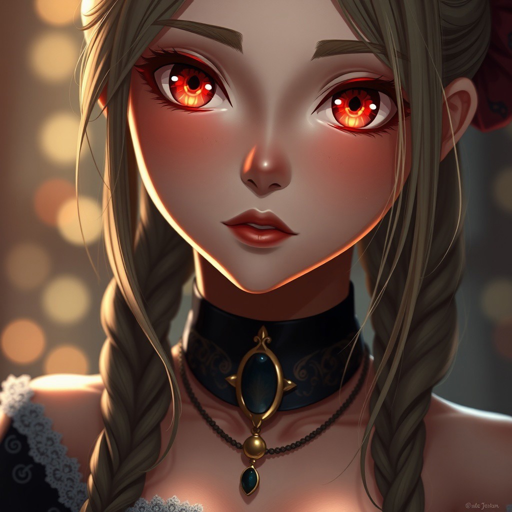 hyperrealistic digital painting by Jeremiah Ketner and Charlie Bowater and Stanley Artgerm and Thomas Saliot and J. Scott Campbell, shallow depth of field, realistic anime, bokeh, lifelike anime woman, closeup on cute face and body, glowing red eyes, lips, light and shadows on face, Irish girl wearing a royal choker, amulet, fully dressed, cleavage