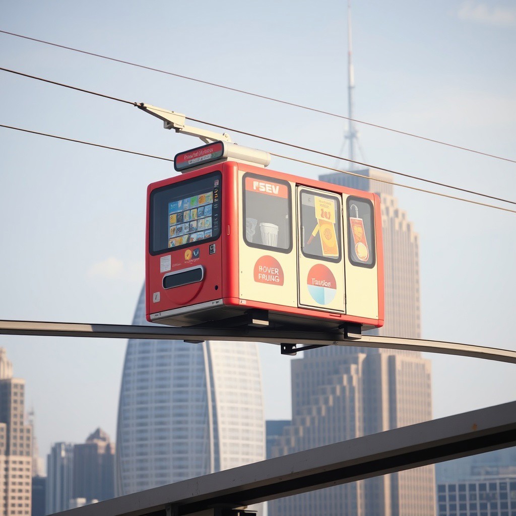 "rover with vending machine on board" on overhead rails rides past open windows of skyscraper