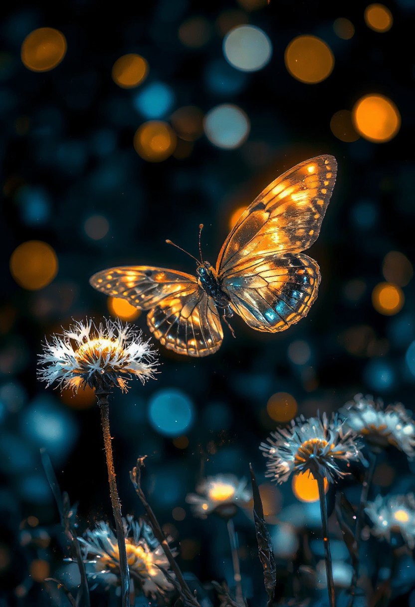 dreamy, magical photograph with a bokeh effect. Picture a transparent butterfly with glowing outlines and spots on its wings, perched on dandelion-like flowers that are also illuminated with a soft glow. The butterfly's wings are delicately veined and seem to be made of glass or crystal. The flowers have fluffy, white seed heads and thin stems. The background is a blurred dark blue night sky, filled with soft, out-of-focus golden lights, creating a bokeh effect. The lighting is soft, warm, and magical, making the butterfly and flowers appear to be gently glowing in the dark, <lora:Vibrantly_sharp_style_v.2:0.8>, <lora:Cozy_Paradise:0.7>, <lora:FluxMythR3alisticF:0.6>