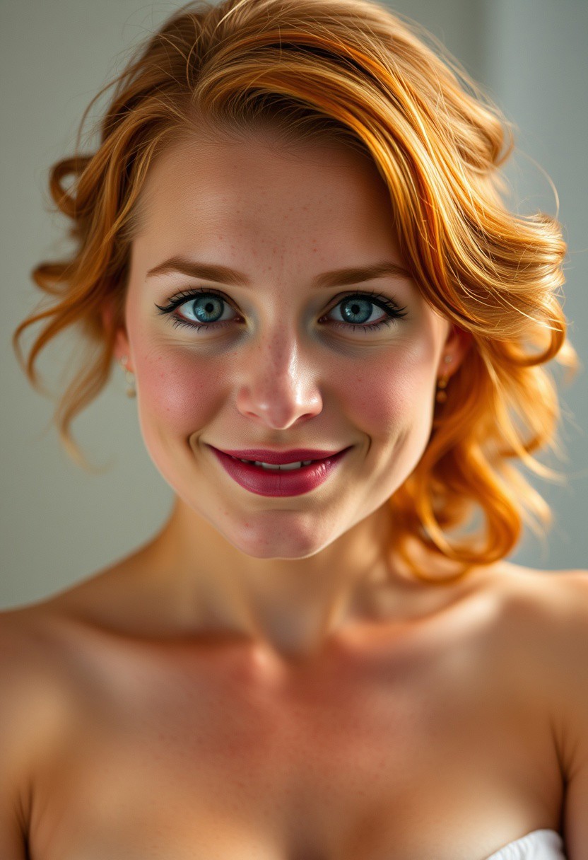 Beautiful woman, Petite, curvaceous figure, freckled skin, round-shaped face, large pale blue eyes, slightly upturned nose, warm smile, full lips, well-defined cheekbones, coppery red hair in soft waves deep cleavage, Full lips,