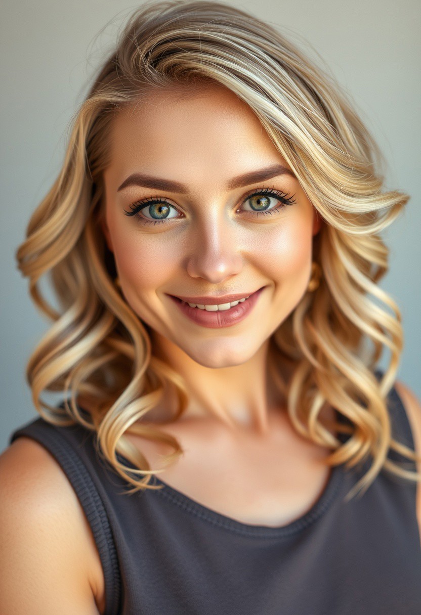 Beautiful woman, Petite, curvaceous figure, fair skin, heart-shaped face, large hazel eyes, slightly upturned nose, warm smile, full lips, well-defined cheekbones, blonde hair in soft waves