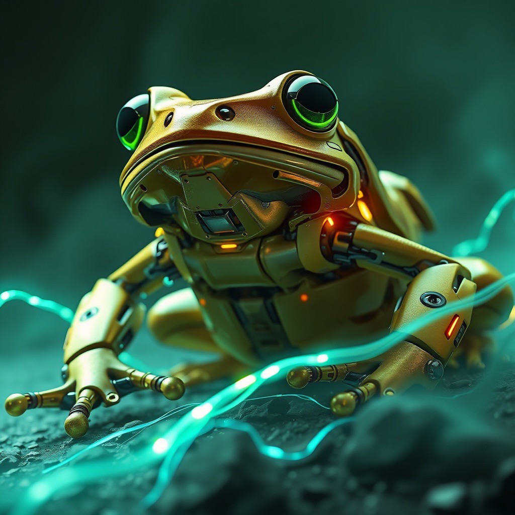 Cybertronic Frog, Robotic Huge Frog, Green and Blue Coloring, Futuristic Sheen, Cinematic View, Massive Experimental Radioactive Frog, High Quality, Sharp Contrast, Melting into Foreground Fragmented Energy, Frog of Mechanical Futuristic, Cinematic View, Grandiose