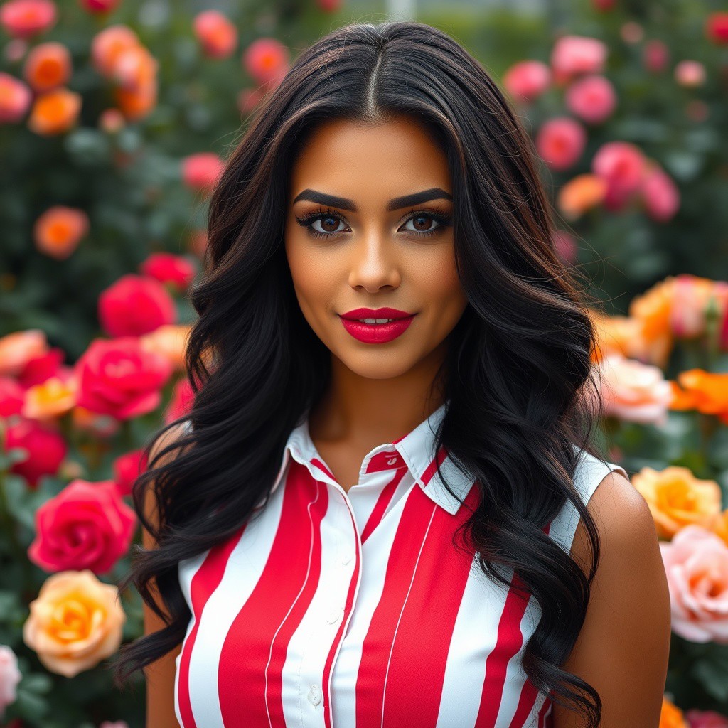 A portrait of a beautiful lady with copper skin, long, wavy black hair, dark brown eyes, and soft red lipstick, wearing a white sleeveless button-down shirt with large red vertical stripes, the light shining from above her head at a 45-degree angle, against a colorful rose garden.
