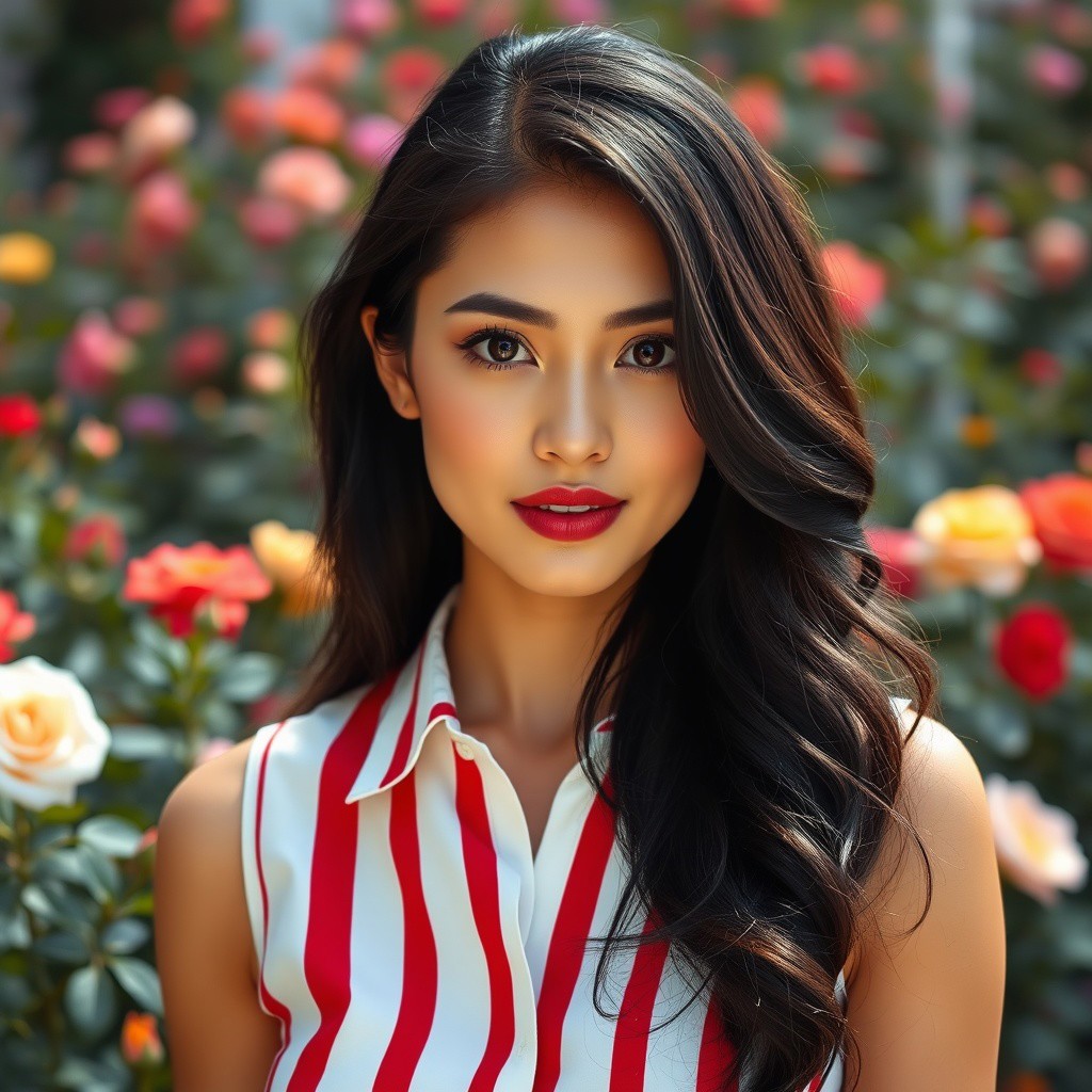 A portrait of a beautiful lady with fair beige skin, long, wavy black hair, dark brown eyes, and soft red lipstick, wearing a white sleeveless button-down shirt with large red vertical stripes, the light shining from above her head at a 45-degree angle, against a colorful rose garden.