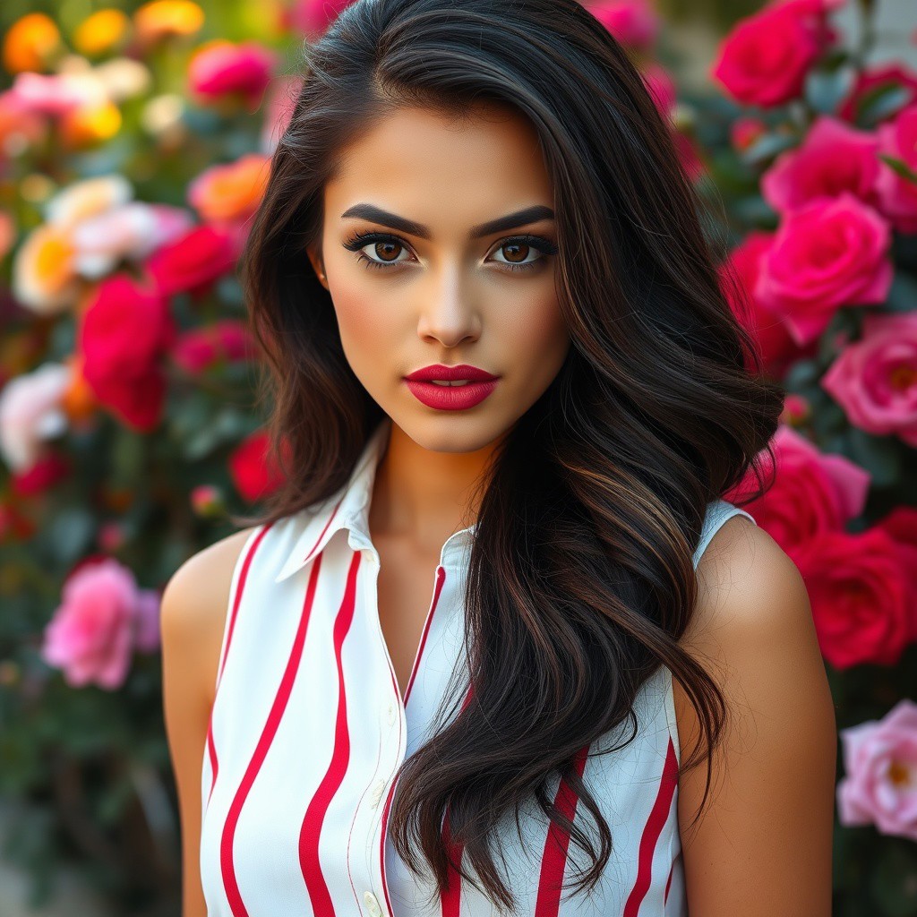 A portrait of a beautiful lady with golden beige skin, long, wavy black hair, dark brown eyes, and soft red lipstick, wearing a white sleeveless button-down shirt with large red vertical stripes, the light shining from above her head at a 45-degree angle, against a colorful rose garden.