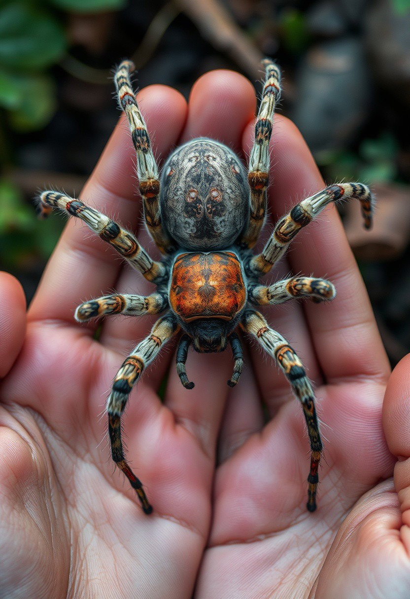 Photoraelistic, hyperdetailed, nature photography, beautiful, detailed, realistic, POV from above. Looking down at a giant spider sitting in my hands, anatomically accurate spider with eight long legs and a rotund abdomen