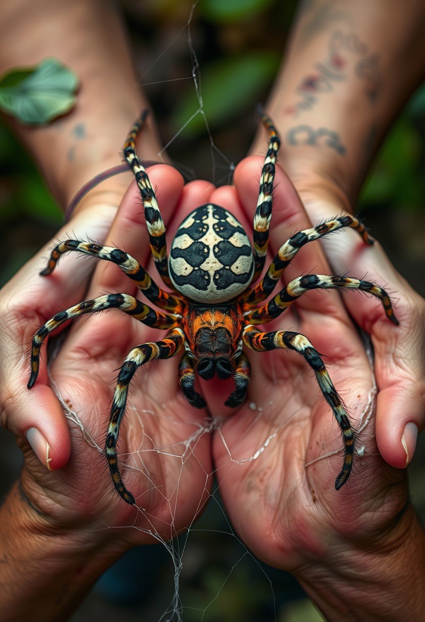 Photoraelistic, hyperdetailed, nature photography, beautiful, detailed, realistic, POV from above. Looking down at a giant spider sitting in my hands, anatomically accurate spider with eight long legs and a rotund abdomen. vibrant colours, striped legs, pattern on body, cobwebs on hands