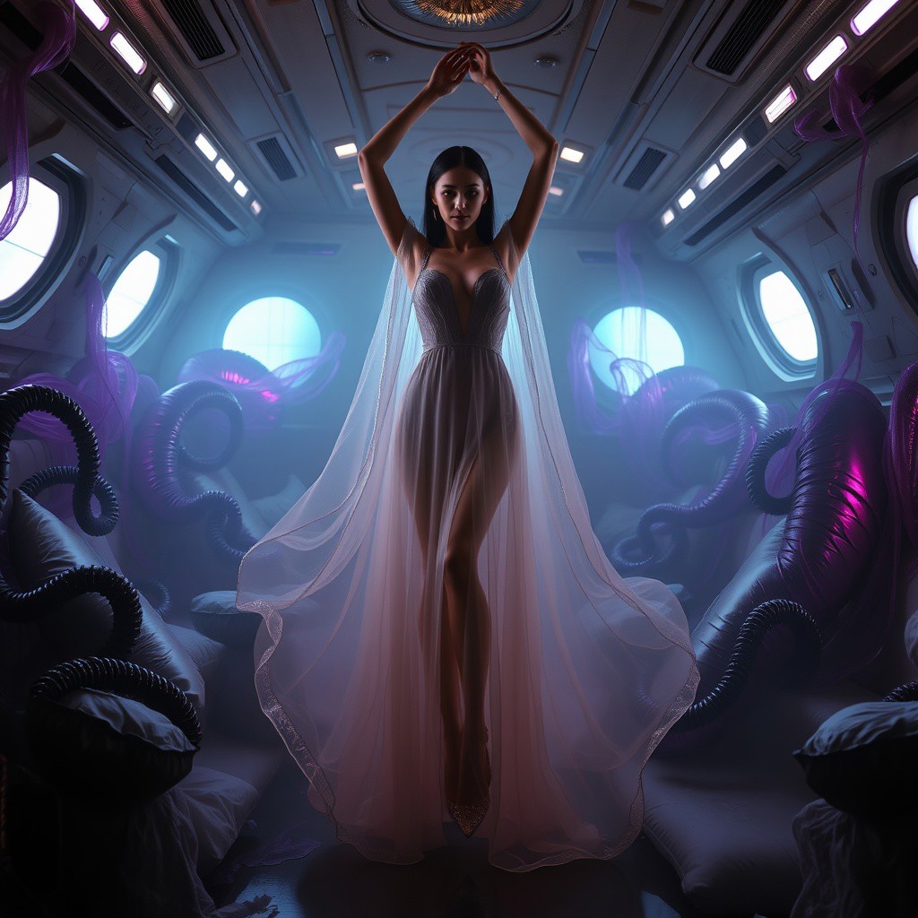 A poised and elegant slender lady, hanged by arms rom celling, arms up . draped in a mesmerizing, floor-length, transparent liquid slime gown, its full skirt resembling a giant, undulating jellyfish, its translucent bell-shaped form glistening with an ethereal sheen, complete with crystal-encrusted high heels that refract and reflect the dim, eerie light, and a flowing transparent slime cloak that seems to shift and writhe like a living entity, is situated within a dimly lit, spaceship boudoir cabin, surrounded by twisted, metallic purple pillows that seem to writhe and twist like alien appendages, as a creeping, eerie fog seeps from the floor, casting an otherworldly gloom, and horror, as if the very space itself is alive, and watching, with aliens lurking just out of sight, behind the slime-encrusted curtains that seem to pulse and throb like a malevolent heart, the entire scene captured in a stunning, cinematic film still, shot on a vintage v-raptor XL camera, with a distinctive film grain, a subtle vignette that draws the eye to the lady, and a rich, cinematic color grade that evokes the sense of a 35mm film masterpiece, post-processed to perfection, with dramatic, atmospheric lighting that casts long, ominous shadows, and an epic, stunning quality that's simply breathtaking, reminiscent of the works of H.R. Giger, Zdzisław Beksinski, and Ash Thorp.