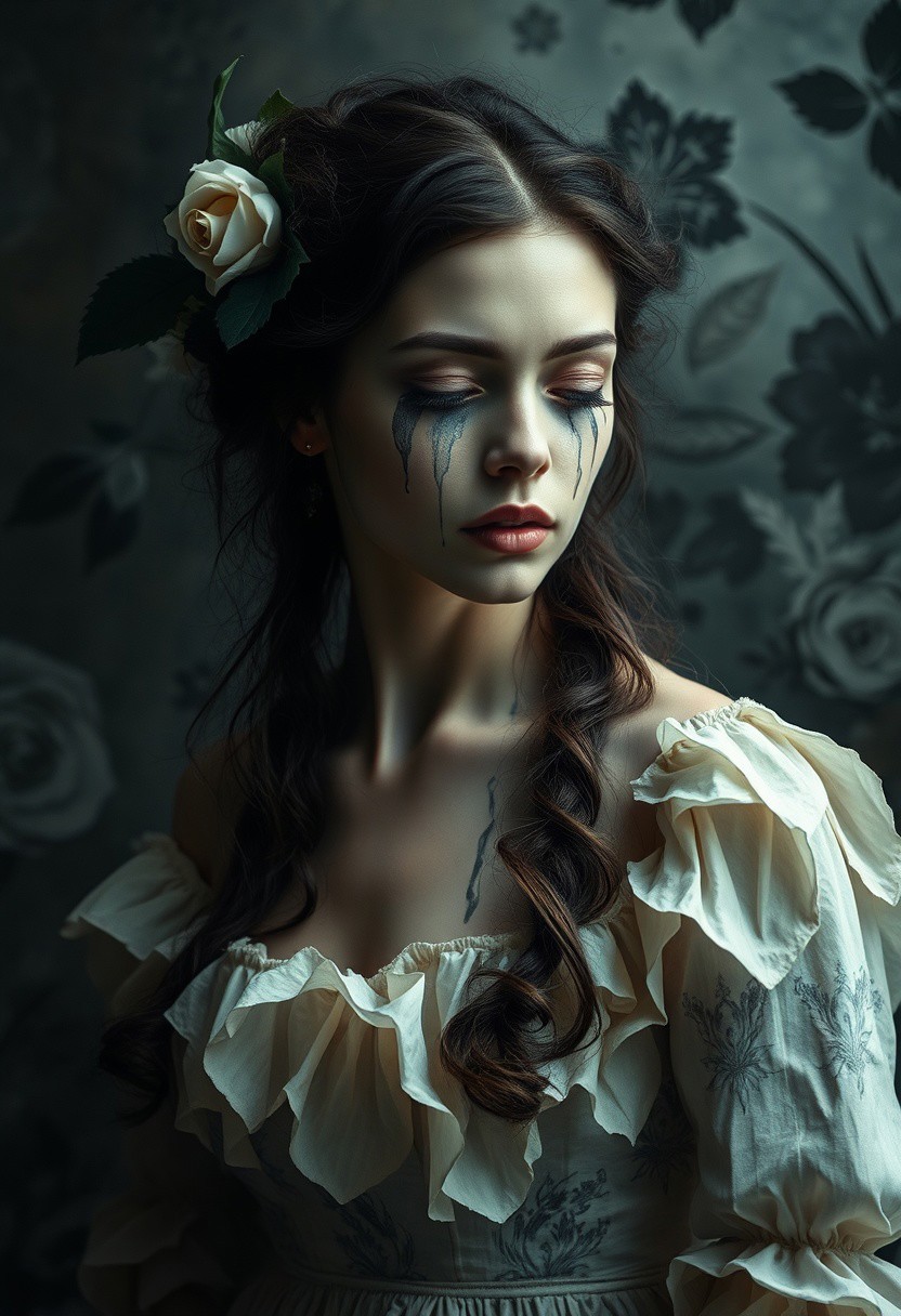 A dreamlike portrait of a woman with tears turning into ink, staining her paper dress ethereal storytelling, melancholic beauty, dark romanticism, elaborate costumes, emotional surrealism, dreamlike atmosphere, fine art photography style, poetic symbolism, nature-infused imagery, delicate textures, rich color palette, theatrical composition, introspective themes