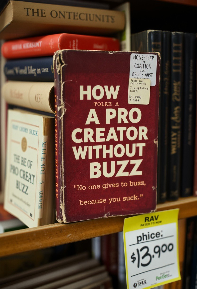 an old book a self-help book with the title in the cover "HOW TO BE A PRO CREATOR WITHOUT BUZZ" and the subtitle "No one gives you buzz, because you suck" with a sticker of low price in a shelves of an old book store