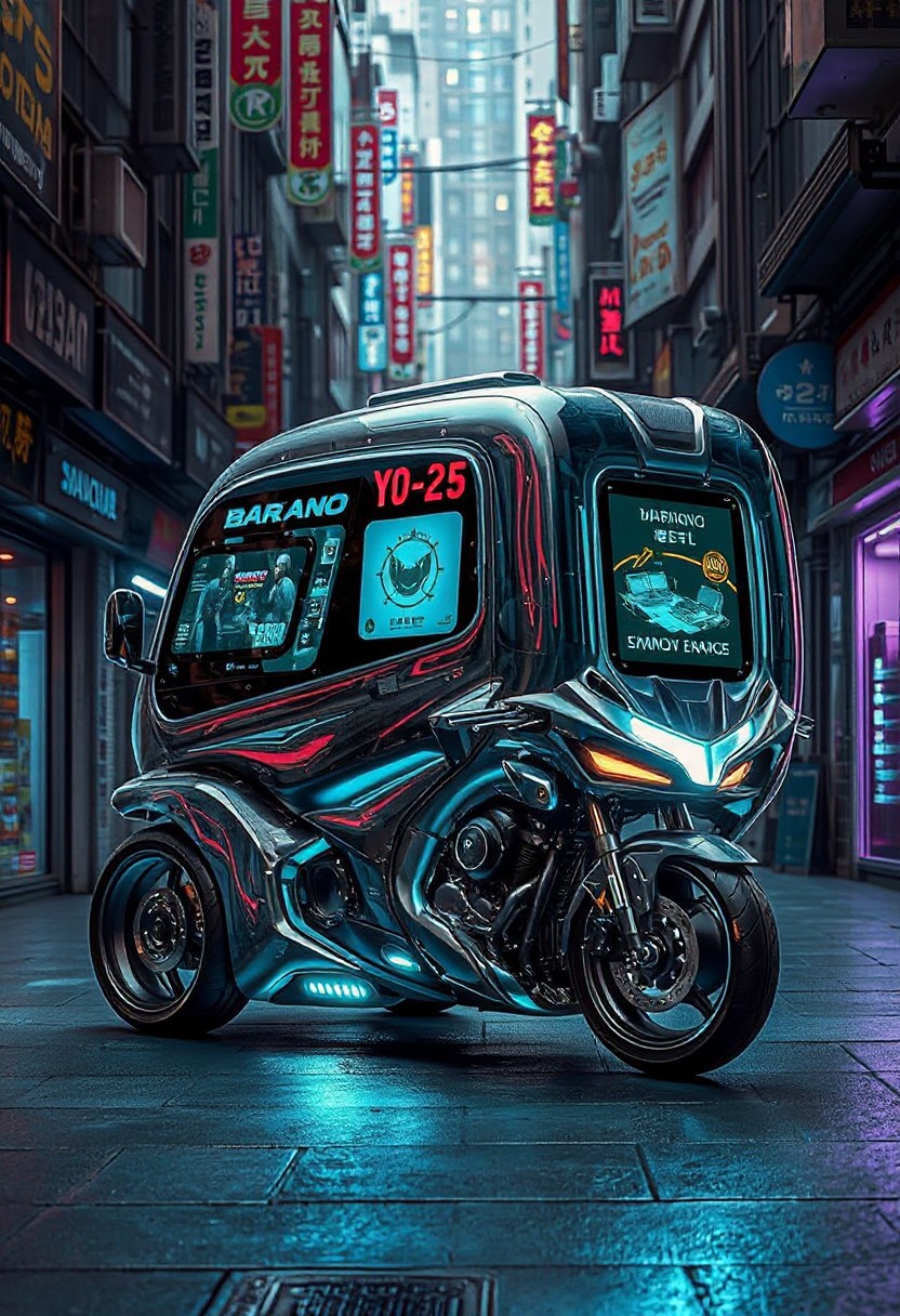 YFG-R1gs, A shape-shifting delivery van, its liquid metal body morphing into a sleek motorcycle, navigates a crowded cyberpunk alleyway. The vanas AI optimizes its form for speed and agility, while its holographic projectors display advertisements on the surrounding walls. The alleyway is a neon-lit maze of shops and kiosks.