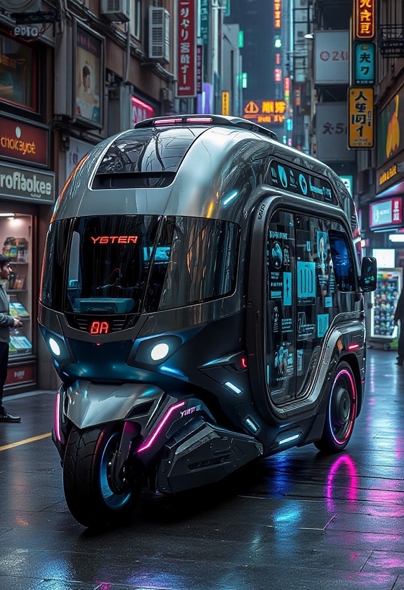 YFG-R1gs, A shape-shifting delivery van, its liquid metal body morphing into a sleek motorcycle, navigates a crowded cyberpunk alleyway. The vanas AI optimizes its form for speed and agility, while its holographic projectors display advertisements on the surrounding walls. The alleyway is a neon-lit maze of shops and kiosks.