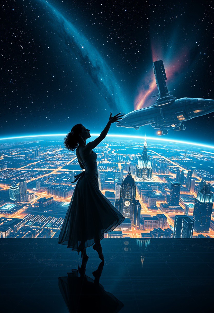 a beautiful elegant female dancer is dancing on a futuristic stage micro-LED lighted, behind the dancer on the stage is an enormous seamless and futuristic wall to wall and floor to ceiling window that looks out at a planet from low orbit, the planet is covered with the lights of enormous buildings and cities, An enormous deco starship with futuristic lighting and an enormous space station are visible in the background among the stars, Artistic art deco, dynamic perspective, (((overall architectural aesthetic is Art Deco Cyberpunk))). Epic image that elicits a feeling of wonder and awe, nebula in distance, extreme detail with city and lights,