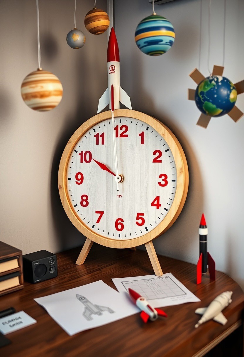 A large light round dial of a lacquered wood dial stands on a desk against the wall. Its thin arrows are made in the form of stylized white space rockets with red nozzles. The numbers on the dial are bright red. the atmosphere of the space theme. Mock-ups of planets and a mock-up of the first Soviet artificial satellite of the earth hang from strings. There are paper drawings of rockets on the table in front of the clock.